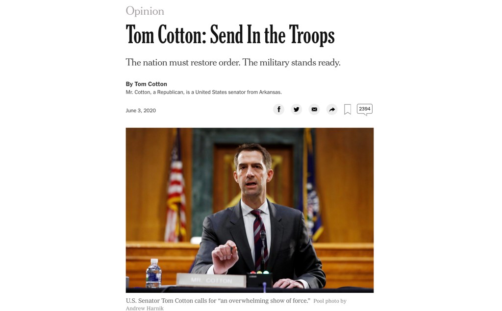 James Bennet, the highly esteemed op-ed (a written prose piece typically published by a newspaper or a magazine which expresses the opinion of an author not affiliated with the publication’s editorial board) editor of the New York Times, had to resign. He was ‘cancelled’. This was because he carelessly commissioned a piece by Senator Tom Cotton that called on Trump to use “overwhelming force” to crack down on the BLM protests (i.e. deploy the military). Cotton made several factual errors when referencing historical episodes in which the military were deployed, and painted a distorted picture that the police were the major victims of violence in the BLM protest (when in fact far more civilians have been killed during the riots than police)